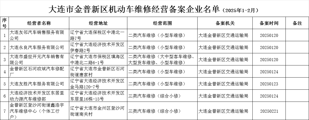 金普新区交通运输局:大连市金普新区机动车维修经营备案企业名单(2025年1-2月)