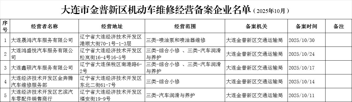 金普新区交通运输局:大连市金普新区机动车维修经营备案企业名单(2025年10月)