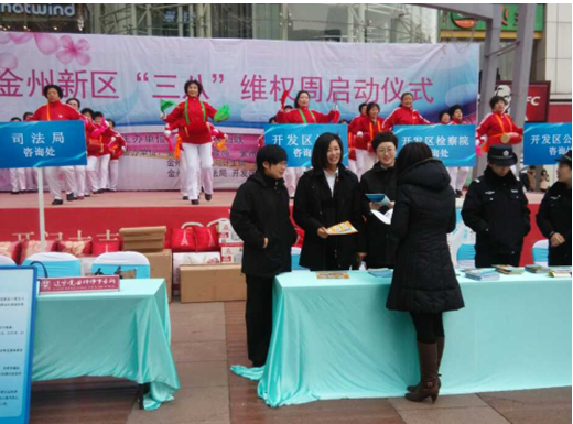 2015年2月28日,我院三名优秀女法官代表参与了由金州新区妇联主办,公检法司等机关协办的“三八”维权周活动的启动仪式,活动的地点设在开发区安盛广场。