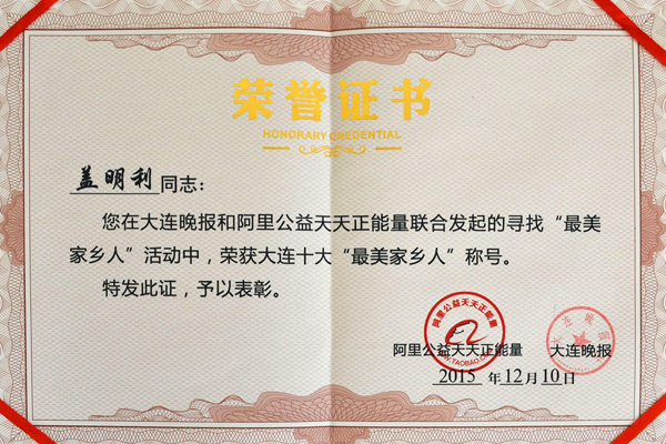 今年8月,阿里巴巴集团旗下公益活动机构阿里公益投入活动资金,联合大连晚报发起“最美家乡人”评选活动,三个月时间里寻访和报道了盖明利在内的十位最美家乡人,多家媒体对此次活动的启动公示、评选程序进行了跟踪报道,大连晚报在12月11日头版刊发了颁奖仪式的详细内容。