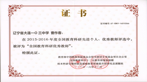 近日,全国2015-2016年度全国教育科研先进个人、优秀教师评选中,大连市一〇三中学副校长兼副书记曹作春同志被教育部中国教师发展基金会评为全国教科研优秀教师,这是103中学教科研工作取得又一个硕果,是对103中学教育科学研究工作的肯定和褒奖。