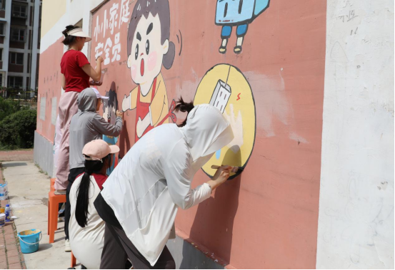 在墙绘现场,老师与学生们携手合作,有的负责勾勒线条、有的负责填充色彩,他们不惧炎热,全情投入,用手中的画笔在居民楼墙壁上描绘出一幅幅生动形象的家庭安全宣传画。不一会儿“小小家庭安全员”、“家庭安全无小事 人人都是安全员”等醒目字样就映入眼帘。路过的居民们也纷纷驻足点赞,表示墙绘活动又好看又实用。不少家长还带着孩子一起参与,现场氛围热烈而温馨。