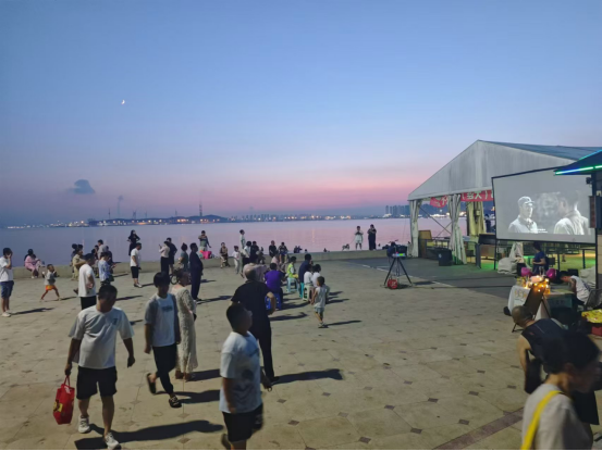夜幕降临,华灯初上,海韵社区的工作人员早早的来到放映现场,协助放映师们准备好放映展架等工具,为电影播放做好充分准备。同时,广场上也早早地聚集了众多居民翘首以盼今晚会播放什么影片。在科教电影《青少年暑期安全自护教育》等短片的余热中,每晚19:15电影准时播放。随着红色影片《八佰》、《除暴》、《红色圩场 》的播放,现场氛围瞬间被点燃。居民们有的自带小板凳、有的三俩人站在一起、有的干脆就在台阶上席地而坐,大家沉浸在精彩的剧情中不易乐乎,更有听到居民说:“已经很久没感受到露天电影的乐趣了,好像回到了童年;孩子在家就是玩手机,这次露天电影也让孩子体验一次我们小时候的乐趣,还可以在观看电影的同时,有机会和其他小朋友一起嬉闹,真的很好。”