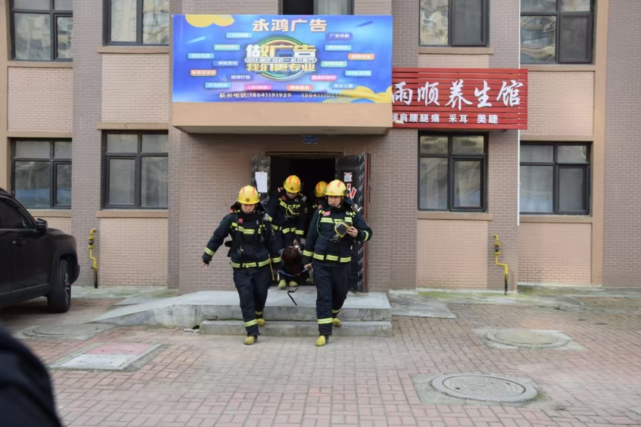 在街道新胜园小区,模拟火灾演练紧张有序地进行。警报拉响,居民们反应神速,迅速用湿毛巾捂住口鼻,这是在火灾发生时避免吸入浓烟中有毒气体的有效方法。随后,他们弯腰低姿沿着安全通道快速而有序地疏散,整个过程有条不紊,展现出居民们出色的应对火灾能力。金石滩消防救援队全程参与,依据消防安全规范,对演练的各个环节进行专业指导,从疏散路线的规划、人员的组织协调到安全防护措施的检查,每一个细节都不放过,全力守护居民的生命安全。