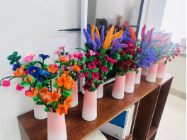 活动现场,工作人员首先为大家分发制作材料,详细讲解仿真绒花的特性及制作步骤。看着桌面上花瓶中已经制作好的精美花束,瞬间就点燃了大家的创作热情,纷纷跃跃欲试,紧跟着视频教程,通过拧轮廓、裹线、打结、捆花瓣……等一道道工序,不一会儿,一株株鲜艳欲滴的花儿跃然而出。