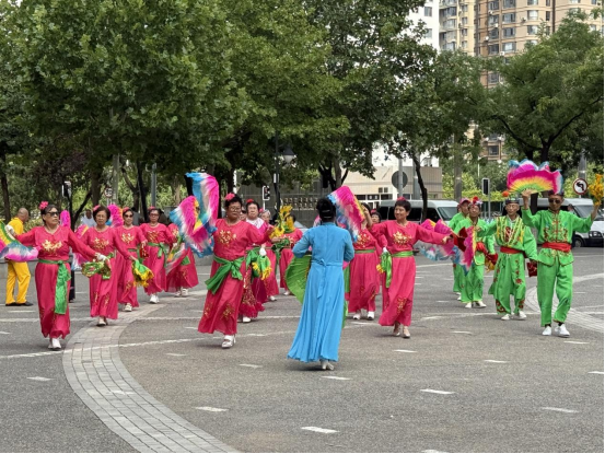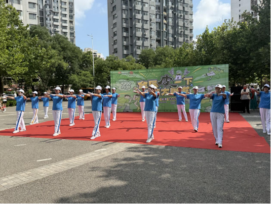 活动现场彩旗飘扬,居民们早早到场围观,气氛热烈而庄重。社区7支舞蹈队依次登场,队员们身着统一服装,精神饱满地随着旋律舞动。《雪莲健身操》的轻快节奏中,大家舒展肢体,动作整齐划一,展现出蓬勃的生命力;《秧歌舞步》的欢快旋律里,队员们手持彩扇,步伐灵动,笑容阳光灿烂,将传统民俗与现代健身完美融合。每一支舞蹈都充满感染力,台下掌声、喝彩声此起彼伏,不少观众跟着节奏轻轻摇摆。