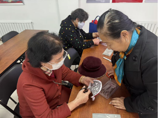 活动现场,大红彩纸、锋利剪刀、精美纹样模板整齐陈列。剪纸达人许阿姨作为志愿老师,耐心讲解技巧:“剪‘福’字要先找中心点,对折后描线要稳,剪曲线时慢一点才流畅。”她手把手指导身边的张爷爷,指尖翻飞间,半个“冬至安康”纹样已初具雏形。徐阿姨格外用心,给字样边缘补了圈波浪花边,笑着说:“剪好了贴在窗户上,冬至那天看着就喜庆。”
