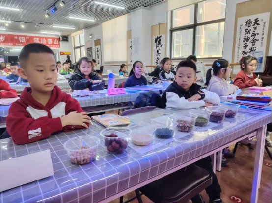 活动伊始,海韵小海娃服务队化身“民俗讲师”,向孩子们详细介绍了腊八节的起源、传统习俗以及腊八喝粥的寓意。志愿者拿出提前准备好的小米、花豆、红豆、黑豆、绿豆、花生、薏米、红枣八种谷物,逐一展示并讲解每种谷物的名称、外形特征及营养价值。在“小小谷物大学问”环节,孩子们有的伸手触摸谷物,有的认真记录特征,还不时举手提问。现场互动氛围十分热烈。“原来这就是薏米,摸起来滑滑的!”“我知道红枣可以补血,奶奶经常给我煮!”孩子们在实践中认识了食材,也理解了“五谷杂粮”背后的农耕智慧与健康饮食理念。