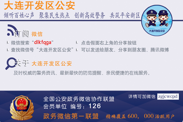 11月初,开发区公安分局“大连开发区公安”微信公众平台正式通过全国公安政务微信协作联盟秘书处审核,成为该联盟第126号会员单位。