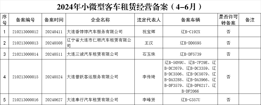 金普新区交通运输局:2024年小微型客车租赁经营备案(4-6月)
