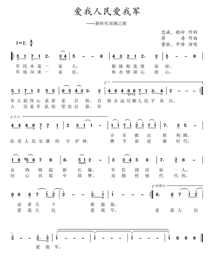 双拥主题歌曲以“爱我人民爱我军”为主题,深入贯彻落实习近平总书记关于双拥工作重要论述和重要指示批示精神,多维度展现双拥工作、军政军民团结的优良传统和特有优势,立场坚定、主题鲜明;将军民守望相助、血肉相连、精诚团结、敢于斗争等元素和壮阔的人民战争画卷、军民携手奋进新时代新征程的昂扬风貌等,有机融入到简洁凝练的词曲中,高扬主旋律、讴歌鱼水情,充分彰显军政军民团结的磅礴伟力,寓意深刻、内涵丰富;将充满温情的民歌曲调与气势恢弘的交响乐曲融合起来,用励人奋进的旋律、情真意切的音符,生动展现双拥优良传统的传承、红色血脉的赓续和奋进新时代新征程的昂扬斗志,明快厚重、催人奋进。