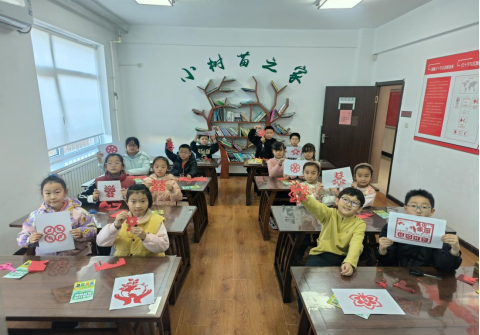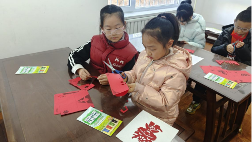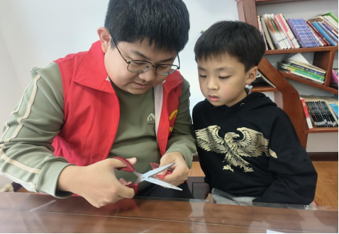 看到精美的作品后,孩子们跃跃欲试,手持红纸细细剪裁,纸屑纷飞间,一张张造型别致的窗花跃然纸上,有寓意吉祥的福字纹样,有灵动可爱的生肖图案。在志愿者的指导下,大家互相交流技巧、分享成果,不一会儿,花纹美丽、样式各异的“分类垃圾桶”“窗花”等作品都崭露头角,跃然纸上。