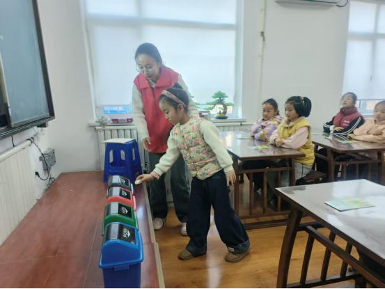活动伊始,志愿者向孩子们发放垃圾分类宣传册、垃圾分类条例,普及生活垃圾分类知识,就四分类投放、生活中容易混淆的垃圾进行详细讲解,通过举例一些日常垃圾来方便孩子们深入了解,并指导大家如何进行正确归类、科学归类,督促他们从身边做起、从点滴做起,养成垃圾分类的好习惯。