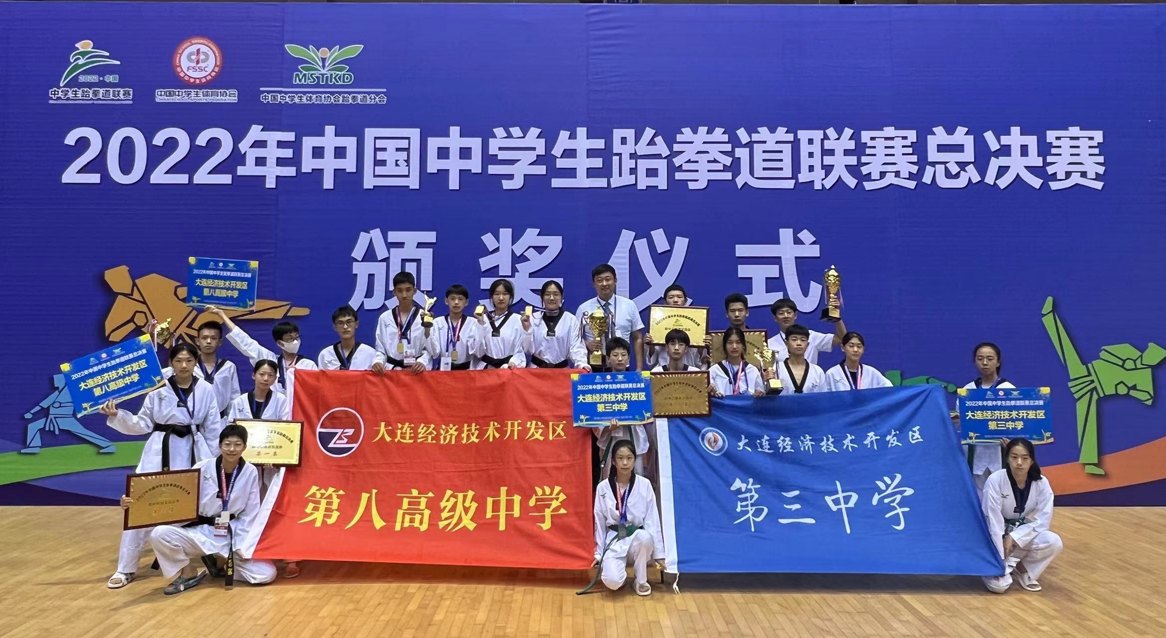国家级赛事中,开发区第八中学获得2022年全国中学生跆拳道联赛总决赛高中甲组(高水平组)团体总分第八名,获得男子个人品势、混双品势、跆拳操、女子68公斤、女子+68公斤五个单项比赛第一名;开发区第三中学荣获2022年全国中学生跆拳道联赛总决赛初中乙组团体总分第二名,获得女子团体品势、男子团体品势、混双品势、跆拳操、个人竞技等单项比赛前三名八项。